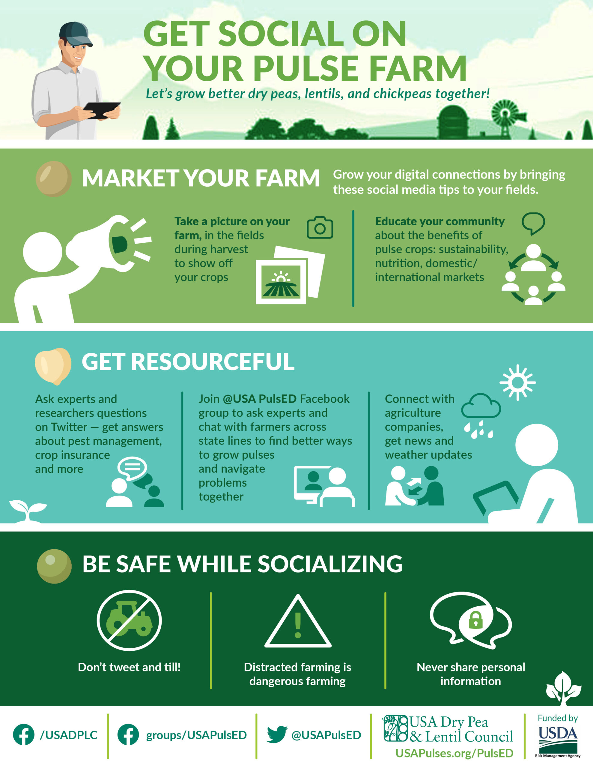 There are endless opportunities on social media for farmers, so we’ve outlined a few tips and tricks to help you get started. Check out our infographics below to learn how to market your farm, find useful resources, and connect with pulse industry members and experts. Â