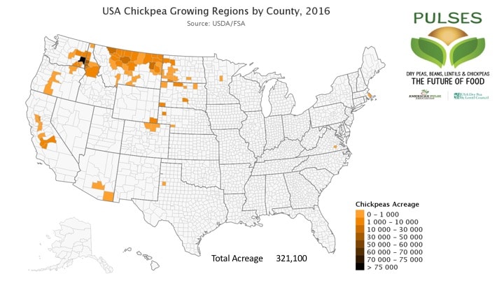 North American chickpea production was once concentrated in California and the Pacific Northwest. Today, U.S. chickpea production is located in Idaho, Washington, Oregon, Montana, North Dakota, South Dakota, Nebraska, Colorado, and California. Production has also expanded to over 1 million acres in the Canadian Prairies (primarily Saskatchewan).
