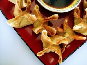 Split Pea Crab Rangoons with Sticky Ginger-Garlic Dipping Sauce